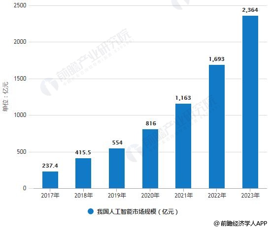 据前瞻产业研究院发布的《中国人工智能行业市场前瞻与投资战略规划分析报告》数据显示,截止至2017年我国人工智能市场规模达到237.4亿元,相较于2016年增长67%。其中以生物识别、图像识别、视频识别等技术为核心的计算机视觉市场规模最大,占比34.9%,达到82.8亿元。初步测算2018年我国人工智能市场规模将达415.5亿元,同比增长75%。预测2019年我国人工智能市场规模将达到554亿元左右。2021年我国人工智能市场规模将突破千亿元,并预测在2023年我国人工智能市场规模将突破2000亿元,达到了2364亿元左右,2019-2023年均复合增长率约为43.73%。