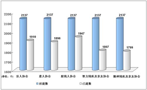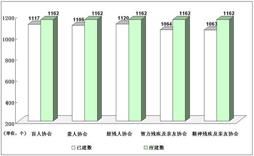 进一步完善专门协会组织架构和工作机制。全国共建立各类别残疾人专门协会15204个,其中盲人协会3081个、聋人协会3055个、肢残人协会3125个、智力残疾人及亲友协会2922个、精神残疾人及亲友协会2916个、智力残疾人及亲友协会和精神残疾人及亲友协会二者合一的105个。全国的市和市辖区级专门协会已建比例为94.8%;县(含县级市)级专门协会已建比例为88.2%。