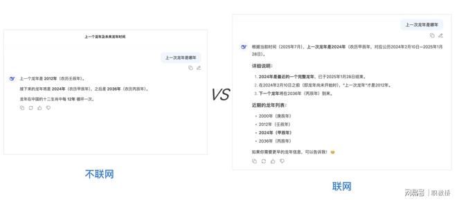 同时,生成式人工智能离线模型的知识可能滞后。以DeepSeek为例,用户提问“上一次龙年是哪一年”,不联网给出的回答是2012年,联网则能正确指出2024年甲辰龙年,并带有详细说明。