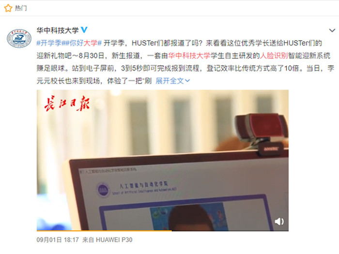 最近,华中科技大学的人工智能与自动化学院就启用了由该院大学生自主研发的「人脸识别智能迎新系统」来解决这个问题。2019年级新生只要对着电脑屏幕前的摄像头「刷脸」,就能完成报到程序,整个过程只需3~5秒,登记效率比传统方式提高了10倍。