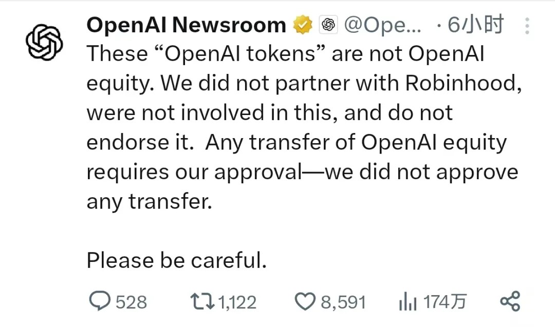 7月3日凌晨4点,OpenAI发布了紧急公告,称这些“OpenAI代币”并非OpenAI的股权。并未与Robinhood合作,也未参与此事,同时不对此表示认可。任何OpenAI股权的转让均需获得OpenAI批准,而其并未批准过任何转让行为。该事件起源于6月30日,Robinhood在法国戛纳举办的一场欧洲加密金融峰会上宣布了一项重大计划:面向欧盟与欧洲经济区用户推出一项名为“股票代币”的新型交易产品。这项创新允许投资者通过区块链技术,以代币形式全天候交易超过200种美国股票与ETF,包括了如特斯拉、英伟达以及一些尚未上市的私有企业包括OpenAI和SpaceX。Robinhood(HOOD.O)美股盘后跌超2%。(华尔街见闻)