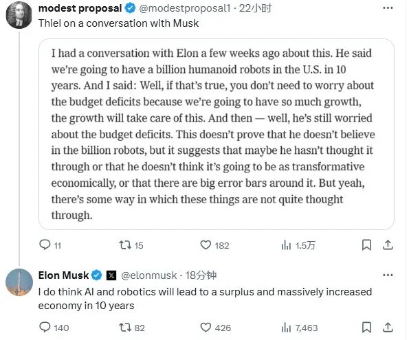 6月28日消息,马斯克在X上发帖称:“我确实认为AI和机器人技术将在10年内导致预算盈余和经济大规模增长。”马斯克是在回应一位用户分享的他和硅谷“风投教父”彼得·蒂尔的一段对话。马斯克告诉蒂尔,美国10年内将有10亿个人形机器人。蒂尔说,如果是那样的话,马斯克就不需要担心预算赤字了,因为我们将会有如此大规模的经济增长,增长将会解决这个问题。(新浪财经)