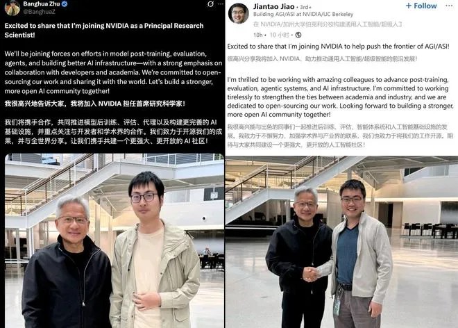 近日,本科毕业于清华大学的AI科学家朱邦华(Banghua Zhu)和焦剑涛(Jiantao Jiao)分别在社交媒体发布和英伟达创始人、CEO黄仁勋的合照,宣布加入英伟达。两人在帖文中均表示,今后将重点围绕模型后训练、效果评估、智能体开发及AI基础设施建设四大领域展开深度合作,尤其将注重与开发社区和学术界的协同创新。各自团队将持续以开源形式分享研究成果,推动全球技术共享。朱邦华本科毕业于清华大学,随后在加州大学伯克利分校的电气工程与计算机科学系获博士学位。焦剑涛本科同样毕业于清华大学,是2011年清华大学特等奖学金获得者。从清华大学毕业后,他又拿下斯坦福大学电子工程系博士学位,主要研究方向为信息论。(网易)