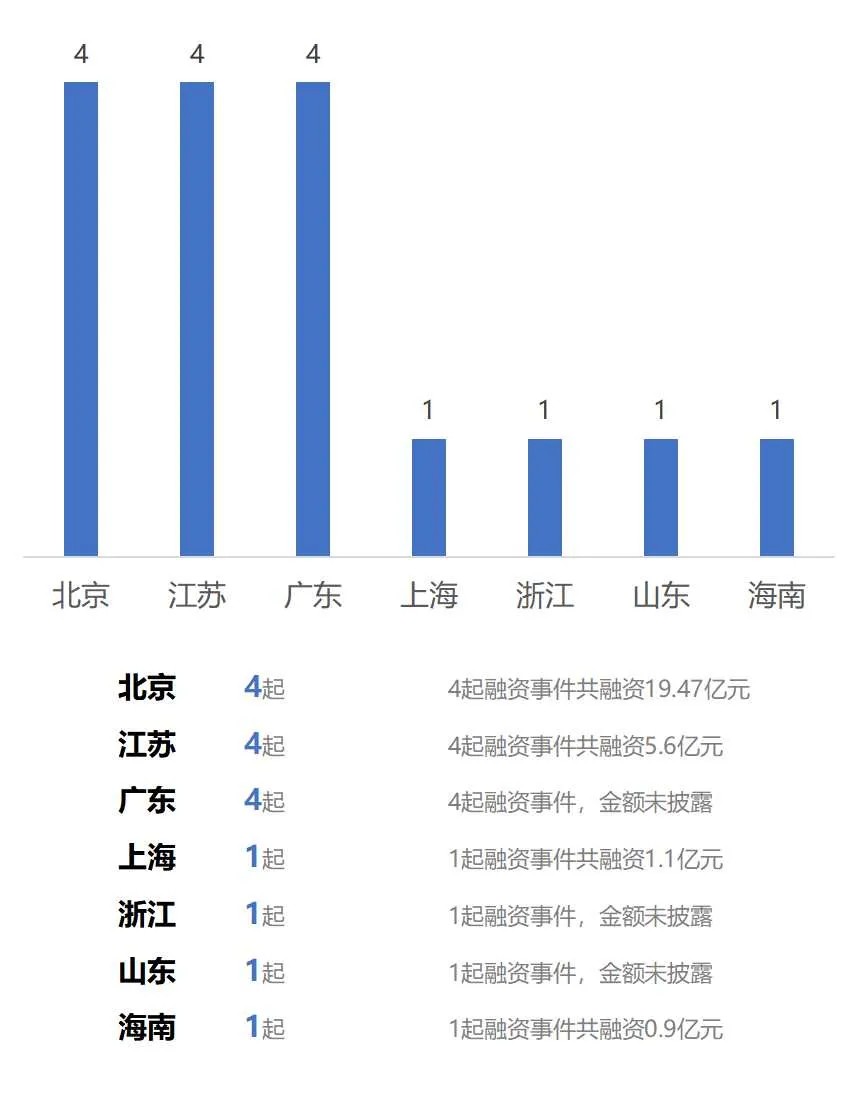 从本周国内披露获投AI企业的地区分布来看,主要集中在北京、江苏、广东、上海、浙江、山东、海南。其中,北京、江苏、广东均为披露5起,上海、浙江、山东、海南均为披露1起。