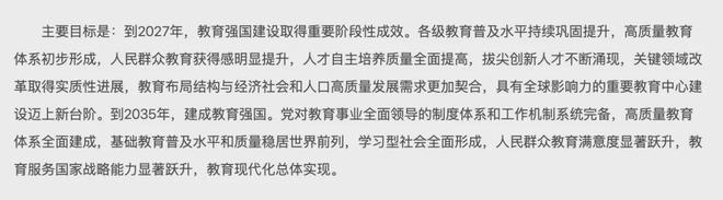 到2035年:全面建成高质量教育体系,学生的身心健康水平、创新能力和国际竞争力将得到全面提升,包括北京在内的一线城市教育资源进一步优化,成为引领全国的标杆。
