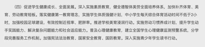 《纲要》强育必须坚持“健康第一”,并为学生的身心发展设定了明确的硬性指标要求。例如,纲要要求中小学生每天至少有2小时参加体育运动,同时将在全国范围内建立学生心理健康监测系统,以有效控制青少年近视率和肥胖率。也就是说,学生的体质与心理健康状况将成为教育评价体系中的硬指标之一,和学业成绩一样受到重视。