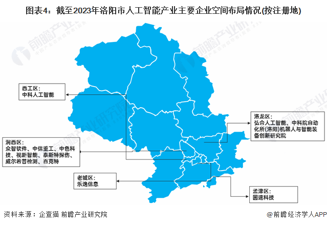 截至2023年,洛阳市人工智能企业主要分布在涧西区与洛龙区,涧西区有企业众智软件中信重工与中色科技等,洛龙区有企业弘合人工智能与中科院自动化所(洛阳)机器人与智能装备创新研究院。