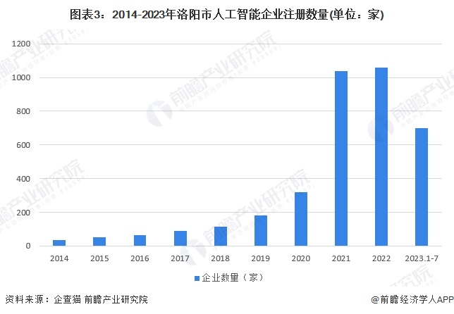 2014-2023年,洛阳市人工智能企业数量增长迅速,于2022年达到最高峰,为1057家,2023年1-7月,洛阳市人工智能企业注册数量为698家。
