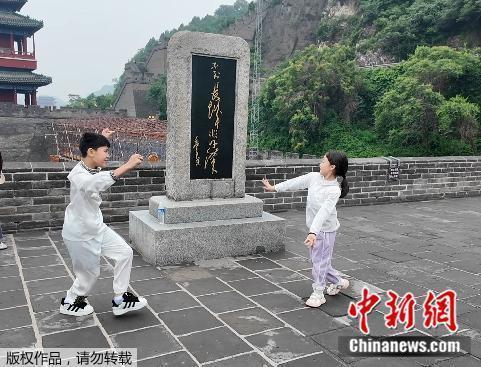 6月1日,来自新疆和田市的拜尔娜阿卜力克木和阿卜杜海拜尔阿拉合麦提在居庸关长城上跳舞。 中新网记者 管娜 摄