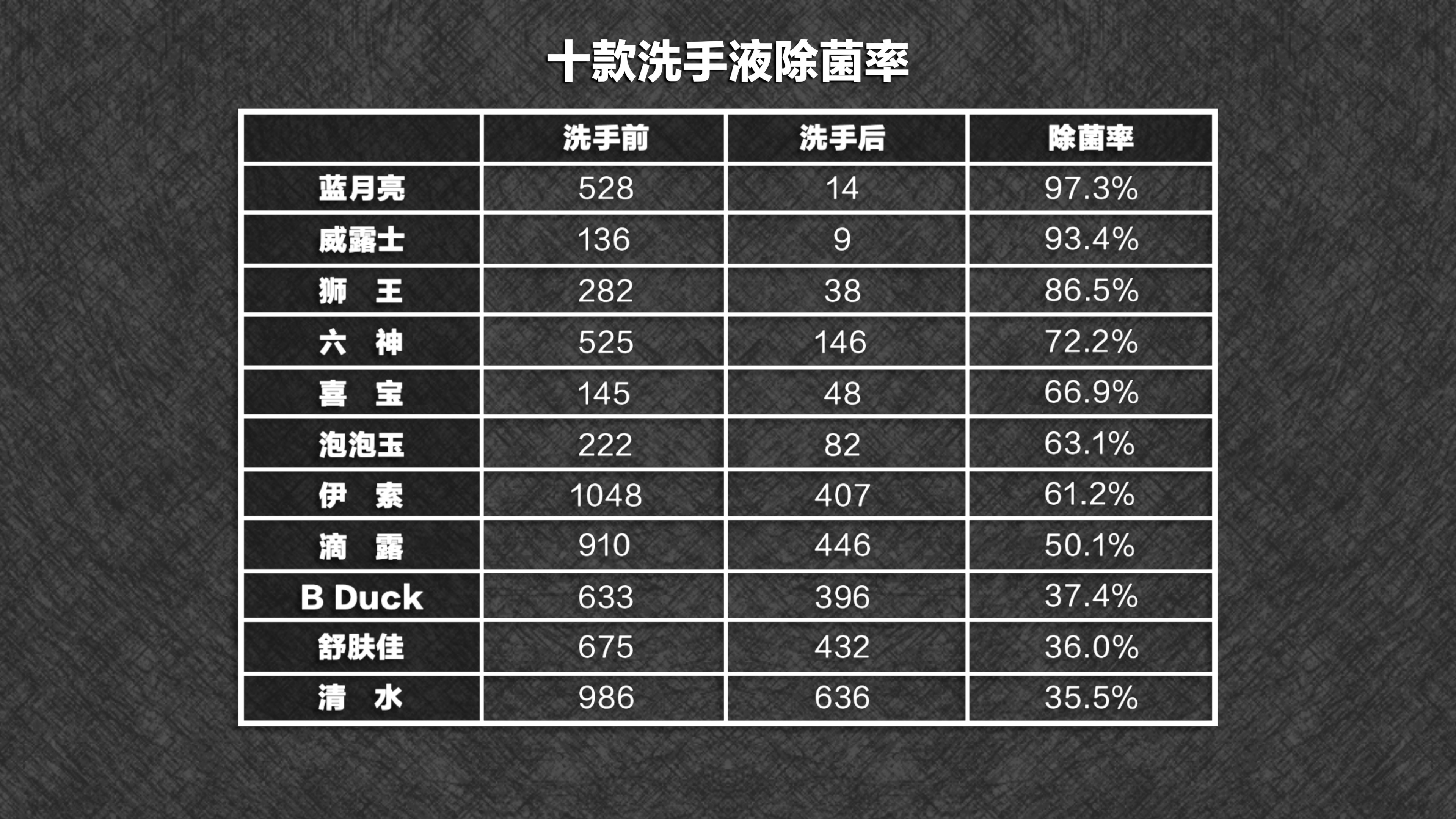 最终,我们可以看到在这10款洗手液的除菌效果对比上,抑菌类洗手液整体略优于普通类洗手液。除菌效果最好的蓝月亮、威露士都达到了90%以上的除菌效果,狮王也紧随其后。第二梯队的六神、喜宝、泡泡玉、伊索都不是抑菌洗手液,但除菌效果却好于号称抑菌率99.9%的滴露和舒肤佳,而后两者的除菌效果只是略高于清水。从结果来看,抑菌类产品并没有那种洗完就99.9%抑菌的美好幻想。