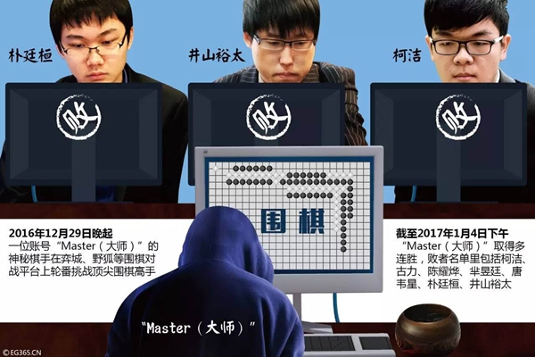 2017年伊始,新年的钟声还在回荡之中,朋友圈便被一位化名“大师”的围棋高手刷屏。截至2017年1月4日夜,这个围棋高手连胜60盘,击败16位世界冠军,包括中日韩“当今第一人”柯洁、井山裕太和朴廷桓等也败在其手下。在没公开身份前,大家基本猜测它应该是机器人,最终“大师”承认自己就是“阿尔法狗”的升级版。