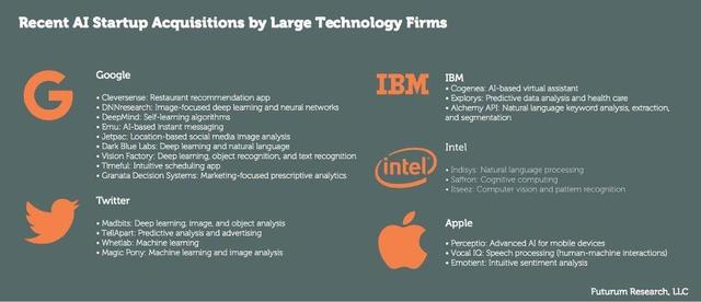 近年来,谷歌已经并购了11家不同的AI公司,部分源自这些投资的技术已经被用于帮助改善谷歌的搜索功能。我们还看到其推出了Google Assistant,即有机器学习技术支持的虚拟助理,可在智能手机Google Pixel和其他配置有谷歌搜索的设备上为用户提供易于使用、语音控制的帮助。2014年,谷歌斥资4亿美元收购了DeepMind,这是迄今为止数额最高的AI收购交易。谷歌团队已经将DeepMind的技术推向极限,其最新机器学习系统TensorFlow很快将向公众免费发布。在图片和语音识别、翻译领域,TensorFlow可模仿人类大脑行为,这使其成为世界上最强大的AI系统之一。