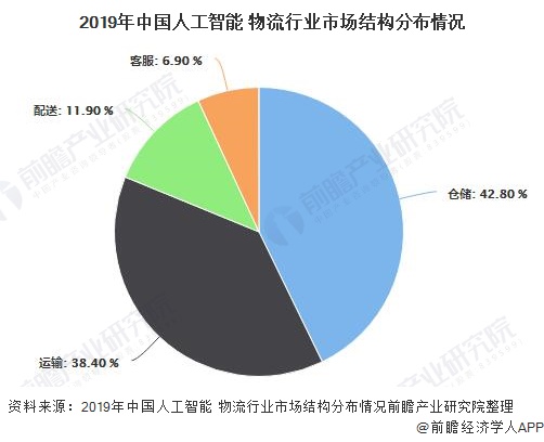 2019年我国人工智能+物流市场主要以仓储和运输为主,其中仓储比重达42.8%,运输比重为38.4%。配送和客服比重较小,分别为11.9%、6.9%。