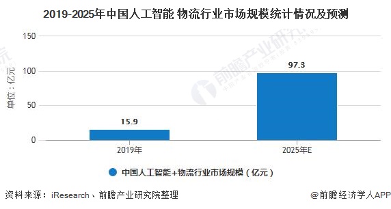 据统计,2019年我国人工智能+物流市场规模为15.9亿元,预计在未来5年内保持年均近44%的高增速,到2025年市场规模近97.3亿元。