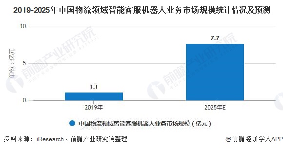 物流领域的智能客服特指以智能语音和NLP技术为代表的客服机器人。从服务类型上可以分为以语音导航、业务识别、智能派单、坐席辅助为主的语音智能客服和以文字查询、业务识别为主的文字智能客服。2019年我国物流领域智能客服机器人业务市场规模为1.1亿元,预计到2025年市场规模达7.7亿元。