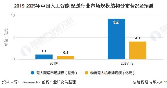 配送是货物流动过程的最后环节,也是物流链条上人力资源投入最重的环节。据统计,2019年我国人工智能+配送市场规模达1.9亿元,其中无人配送市场规模为1.1亿元,物流无人机市场规模为0.8亿元。预计到2025年人工智能+配送市场规模达13.4亿元。