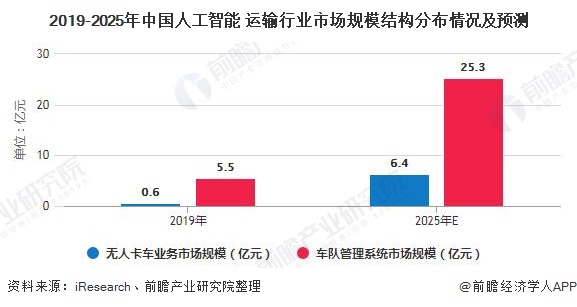 据统计,2019年我国人工智能+运输市场规模达6.1亿元,其中无人卡车业务市场规模为0.6亿元,车队管理系统市场规模为5.5亿元。预计到2025年人工智能+运输市场规模达31.7亿元。