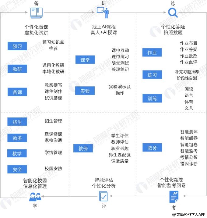 根据科技部与罗兰贝格的研究,教学全流程可分为备、教、练、考、评、管六大环节,涵盖了从课前、课中、课后的全部环节。AI技术在教育中主要的应用场景包括,自适应学习、AI伪直播、分级阅读、智能批改、智能题库、智能测评、拍照搜题等。