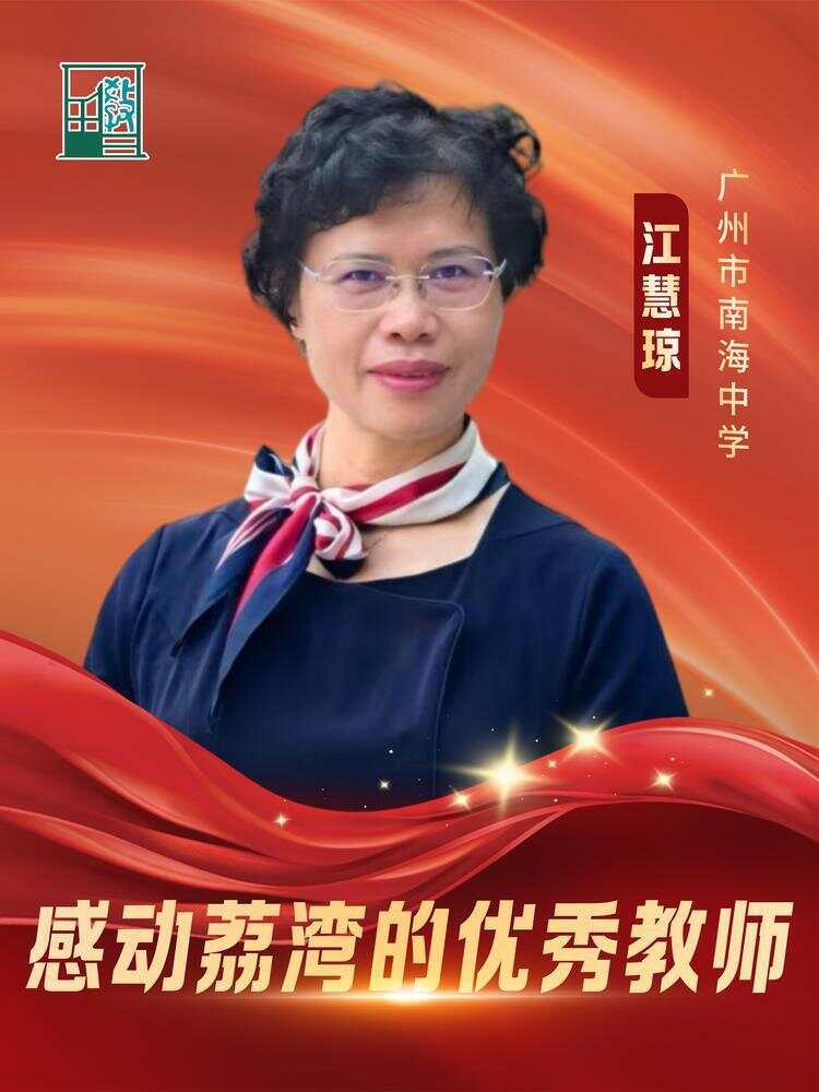 江慧琼,党员,语文中学正高级教师,广东省特级教师,广州市南海中学教研处主任。从教27年以来,她一直坚守在荔湾教育教学工作的第一线,爱岗敬业,潜心育人。注重“研干结合”,带着科研的意识教书育人。根据学生成长规律和年龄特点,确立各阶段工作的方向和重点,以爱心和耐心开展“春风化雨”的育人工作。