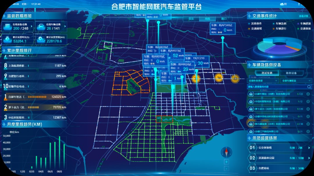 随后,记者来到合肥市智能网联汽车创新中心,这里运营合肥市新能源汽车和智能网联汽车大数据中心,在智能网联汽车监管平台上,可清楚看到,智能网联汽车在高速测试的场景。“平台主要监管合肥市的智能网联汽车,包括车辆、路测设备和接入企业等。截至8月底,智能网联汽车监管平台接入车辆共408台,接入企业数共计57家,包括上路测试的10辆尊界S800。”工作人员告诉记者,测试里程、时长、行驶路线等都能实时监管。