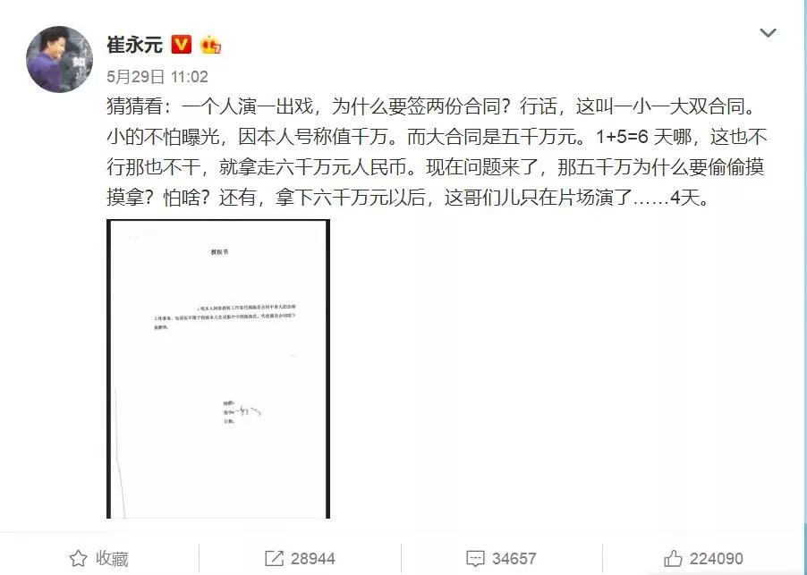最狠的是,崔永元晒出了一份无名无公章的合同,并爆料称:“这是这叫一小一大双合同。小的不怕曝光,因本人号称值千万。而大合同是五千万元。”