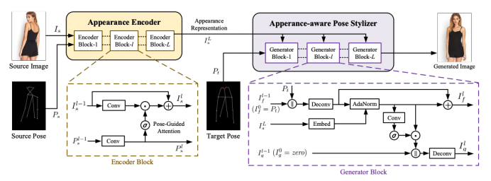 在大规模图文内容生成任务中,市场需要机器学习算法和模型扮演一种媒体智能(Media Intelligence)角色。在许多生成问题上,由于各种原因限制用户需求,需要将给定的人像变换一种形体姿态作为展示,并且保持人物形象、外貌特征、和穿着不变。百度研究了在给定人物肖像图片、原始姿态标签、以及目标姿态标签的情况下,根据目标姿态标签,生成人像的深度学习模型。该模型拥有两个部分 (a)Appearance Encoder:能够将人物肖像根据其姿态标签进行面向体貌、穿着的特征编码,以及 (b)Appearance-aware Pose Stylizer (APS):能够将体貌、穿着特征重新根据目标姿态标签解码成为人像图片。该算法模型的核心难点是如何在训练中将体貌、穿着特征与人像的姿态分离 (disentangle)。本文提出的算法与模型在多个数据集上取得了优秀的成果。其姿态编辑出来的图片几乎人眼不可辨别真伪,并能够保有原始中人像的大量风格要素。