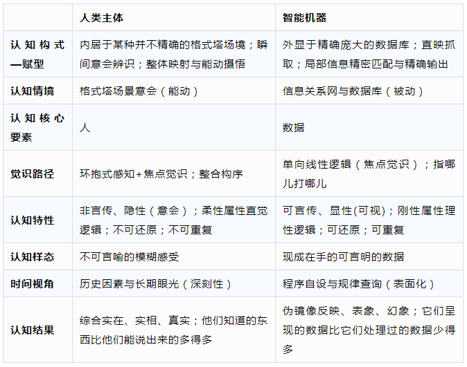 知识的类型既有抽象的可以书写的知识,亦有“无字”的默会知识。而这种默会知识是区分人类认知机制与机器认知机制的关键之处。人类主体具有智能机器无法习得的意会推论的逻辑特性与能力,即人类能够创造与生产那些非言说的“意会知识”。