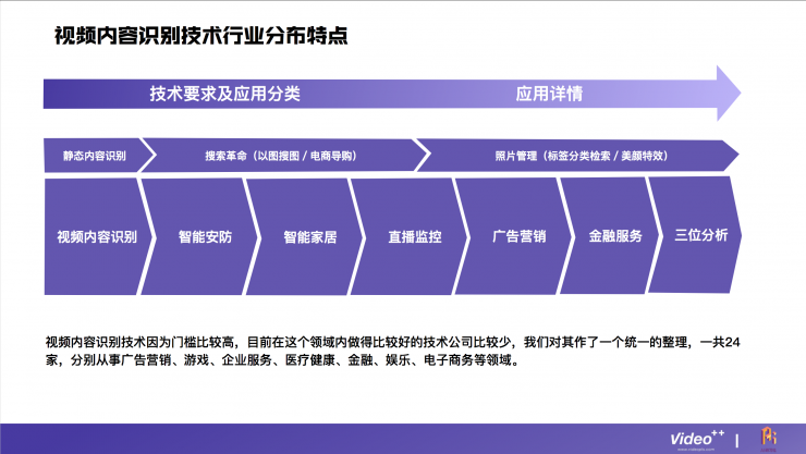 视频内容识别技术在整个行业中是比较难的,门槛比较高,所以在这个领域做得比较好的公司并不多,目前国内大概有24家,分别涉及到广告营销、游戏、企业服务、医疗健康、金融、娱乐、电子商务等领域。
