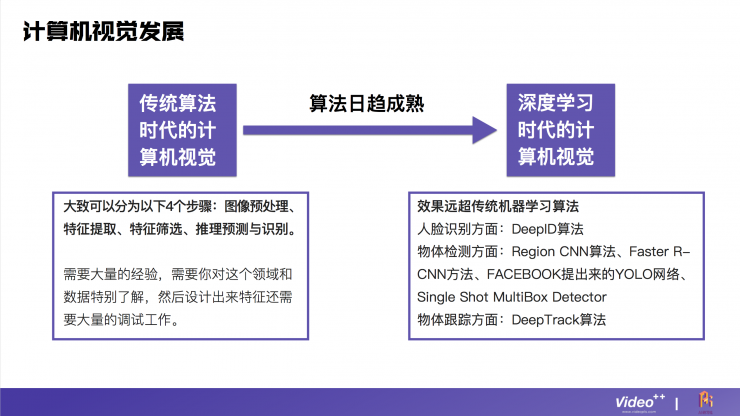 而从计算机视觉领域本身来看,传统机器学习的算法需要大量的经验,需要研究的人员对这个领域和数据特别了解才行。而现在由于深度学习的应用,效果得到了极大的改观,并出现了一系列针对不同细分领域的算法,例如人脸识别方面有DeepID算法、物体检测方面有Region CNN算法、Faster R-CNN方法等。