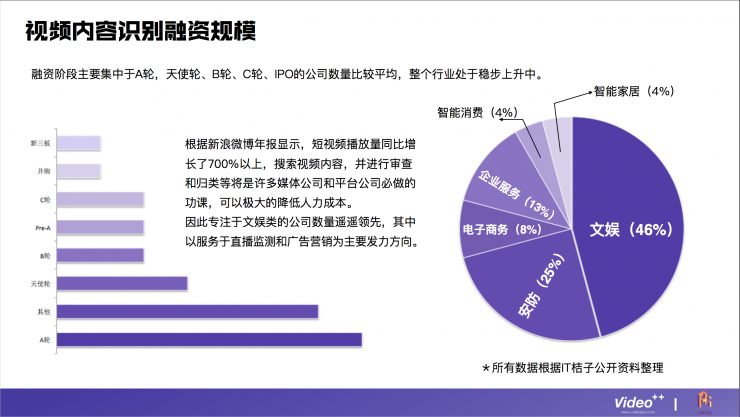 在融资方面我们可以看到两个特点:第一、大多数企业正处在A轮融资阶段,这说明大多数企业都还处于刚起步阶段;第二、专注做文娱的公式占差不多一半左右,这主要是因为目前短视频播放量增长迅猛,搜索视频内容、审查、归类等是许多媒体公司和平台公司必做的功课,可以极大的降低人力成本。