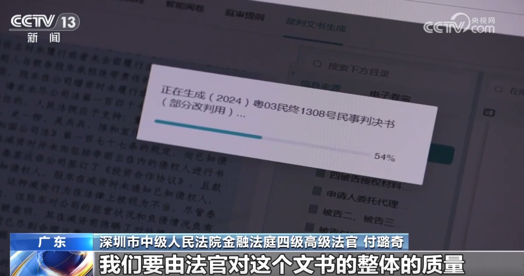 深圳市中级人民法院金融法庭审判长四级高级法官付璐奇称:“传统的阅卷方式就是有这么多书面的纸质材料,之前,我们要用一整天的时间去阅卷梳理材料,然后把核心的重要的内容整理出来,形成文字。现在有了AI之后,可能它工作的时间只有几秒钟,然后我们再用大概半个小时的时间去复核确认这个信息,这个工作就可以完成了。”
