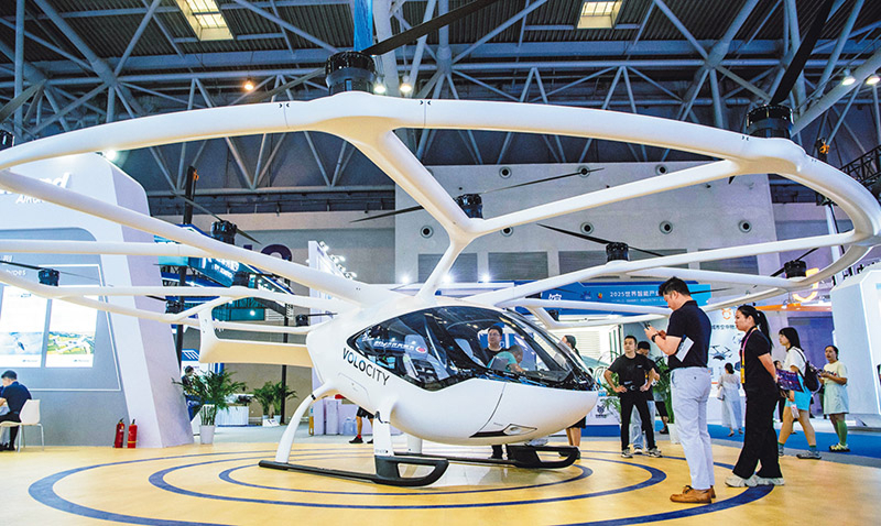9月5日至8日,2025世界智能产业博览会在重庆举办。本届博览会聚焦“人工智能+”和“智能网联新能源汽车”两个主题,集中展示了人工智能科技创新与产业创新深度融合等方面的最新成果。图为观众在博览会上参观体验电动空中出租车。 新华社记者 唐奕/摄