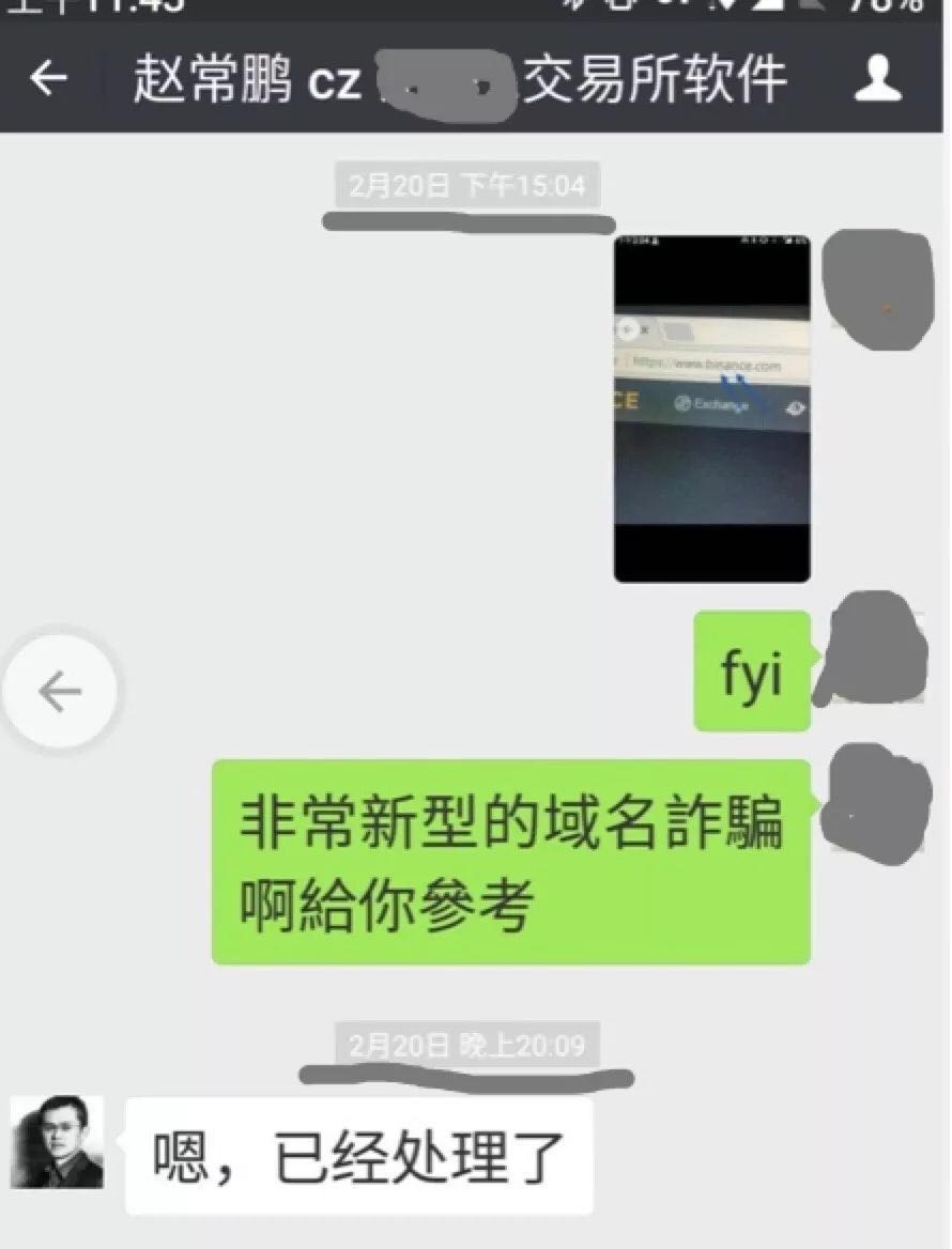 有微信截图显示,早在2月20日,有人向币安交易所创始人赵某发布了钓鱼警告,他表示问题已得到处理。从币安的后续措施来看,他并未把这个警告当真,至少没有向存在风险的用户发布警告,以求尽力挽回损失。