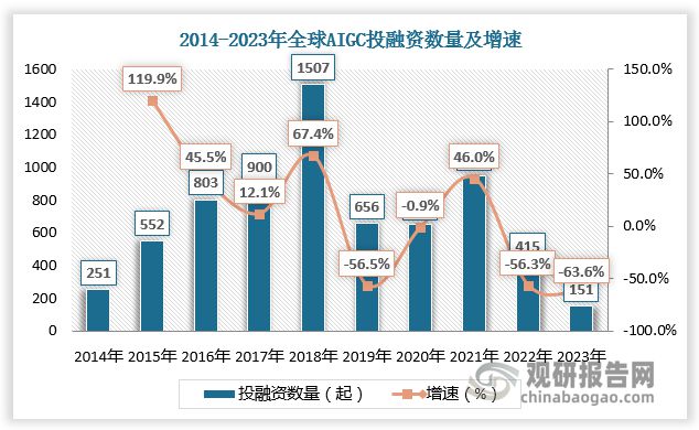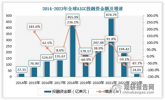 随着AIGC行业进入快速发展阶段,AIGC成为资本布局的热门赛道。根据数据,2018年、2021年全球AIGC投融资市场火热,投融资数量分别为1507起、949起,增速分别为67.4%、46.0%;2018年、2021年全球AIGC投融资金额分别为455.99亿元、474.79亿元,增速分别为236.1%、91.8%。