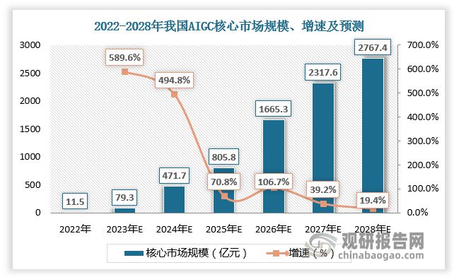 资本相继下场,全球AIGC应用加速落地,展现了其高成长性。中国AIGC市场在互联网普及、人工智能技术革新以及国家政策倾斜等各因素的推动下也进入爆发式增长阶段,市场发展潜力巨大。2022年我国AIGC核心市场规模达11.5亿元,2023年我国AIGC核心市场规模约为79.3亿元,较上年同比增长589.6%。预计2028年我国AIGC核心市场规模约为2767.4亿元,较上年同比增长19.4%。
