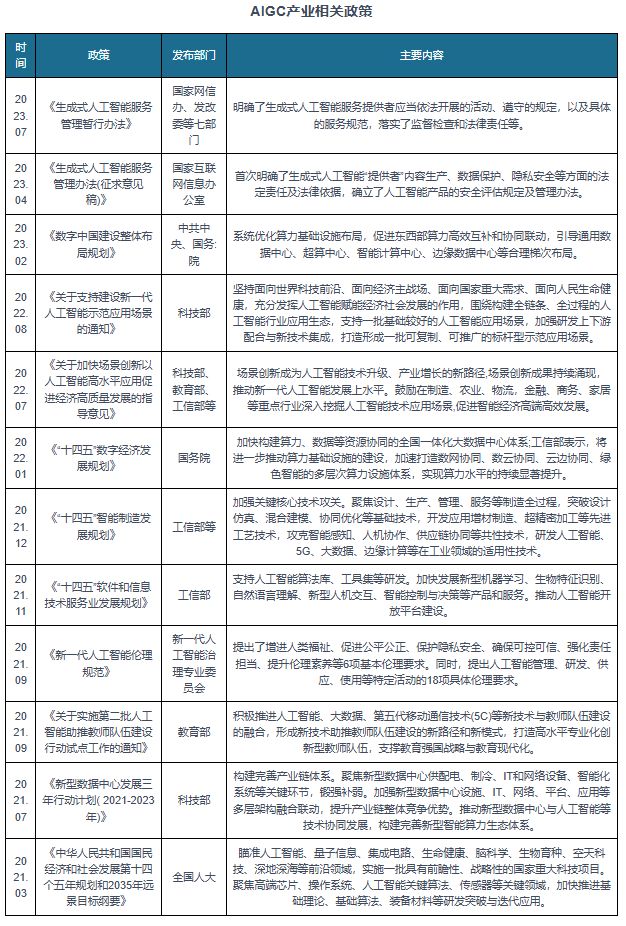 近年来,国家陆续出台多项鼓励政策支持和引导AIGC产业发展。如《中华人民共和国国民经济和社会发展第十四个五年规划和2035年远景目标纲要》提出瞄准人工智能、量子信息、集成电路、生命健康、脑科学、生物育种、空天科技、深地深海等前沿领域,实施一批具有前瞻性、战略性的国家重大科技项目,聚焦高端芯片、操作系统、人工智能关键算法、传感器等关键领域,加快推进基础理论、基础算法、装备材料等研发突破与迭代应用。