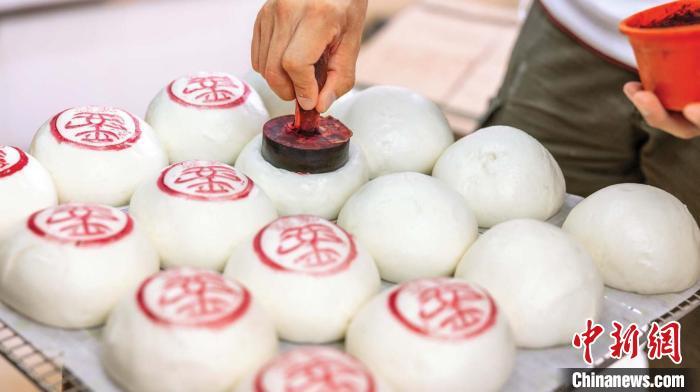 5月2日,屹立长洲岛40年的老字号饼店郭锦记第二代传人郭宇钿接受 中新社记者采访时表示,近年来越来越多旅客对长洲岛文化产生兴趣,报名参加平安包工作坊。图为工作坊制作平安包。(受访者供图)
