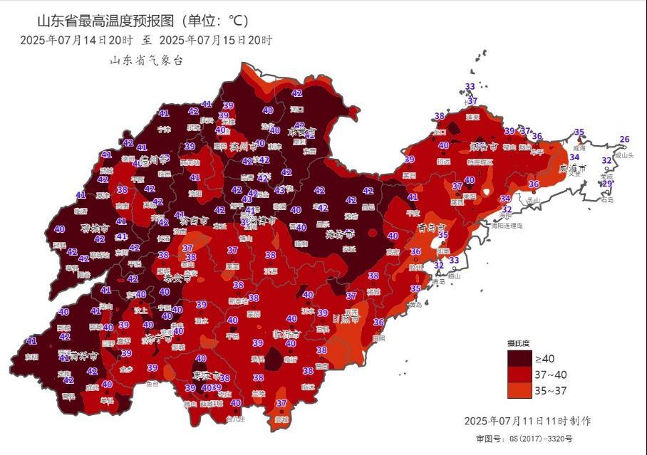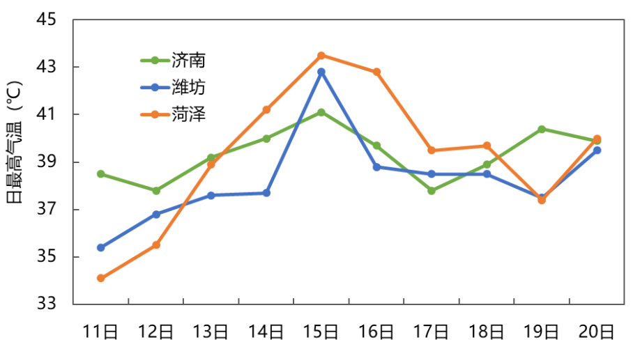 根据山东省气象台最新预报,预计未来10天,受副热带高压和大陆暖高压影响,山东高温少雨天气仍将持续。11—13日,鲁西北和鲁中地区最高气温37—39℃,局部40℃以上,南部沿海地区28—31℃,其他地区33—36℃;14—15日为高温热浪最强时段,内陆地区最高气温可达38—40℃,局部42℃以上;16—20日,内陆地区仍有37℃以上高温天气,局部可达40℃。