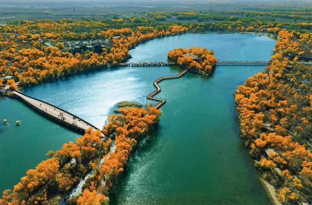 景区中的古道角力场,每到胡杨节,就会上演国家级非物质文化遗产保护项目叼羊、赛马等民间体育活动。景区中还有标志性的“丝路第一馕坑”,这个规模近似一幢楼房的馕坑,曾烤制出重400公斤的全骆驼。金色胡杨岛上,可以看到胡杨与湿地的交融共生,感受沙漠绿洲蓬勃的生命力。
