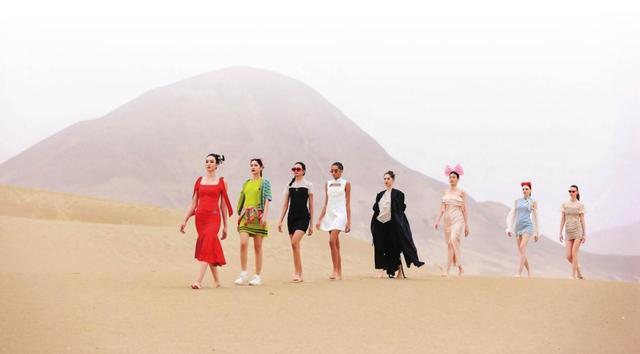 作品由法国巴黎国际时尚艺术学院上海校区师生以新疆沙漠风情与沪喀文化交融为灵感精心打造。这种在原生态沙漠中走秀、观秀的创意形式,开创国内时尚活动先河。