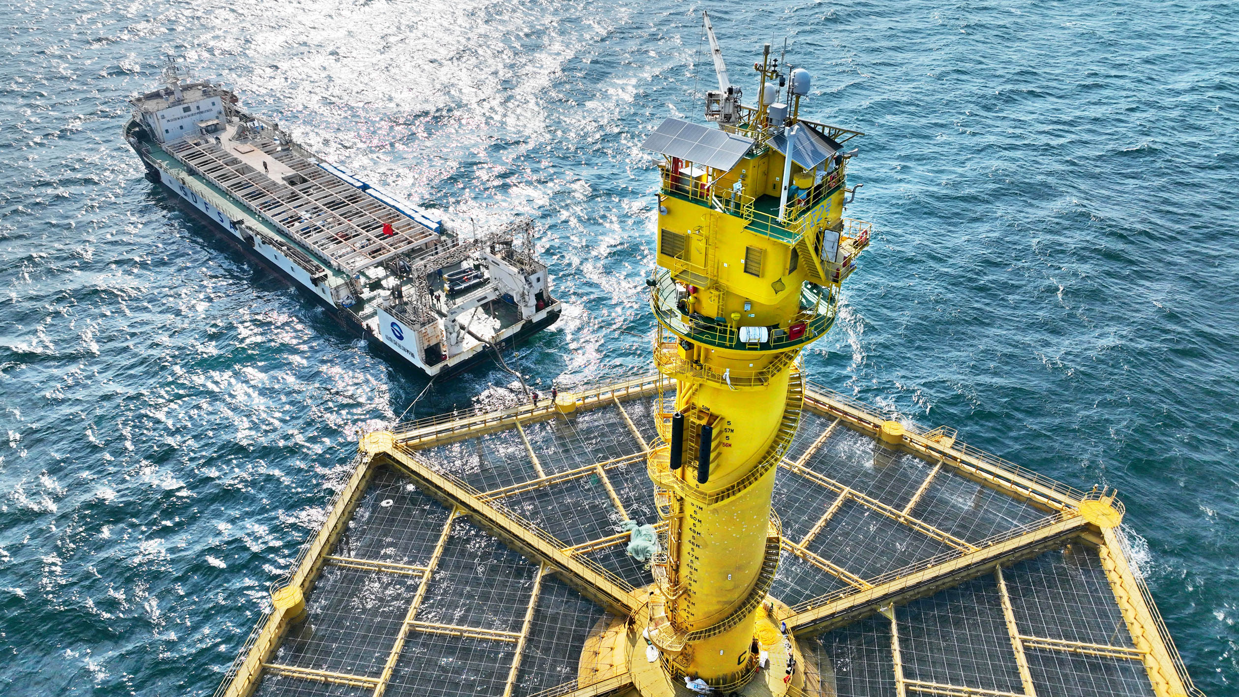 今年1月,在青岛国家深远海绿色养殖试验区,中国自主研制的大型深海智能渔业养殖装备“深蓝2号”迎来首次三文鱼收鱼作业。图为“深蓝2号”与养殖工船在进行联合收鱼作业(无人机照片)。新华社记者李紫恒摄