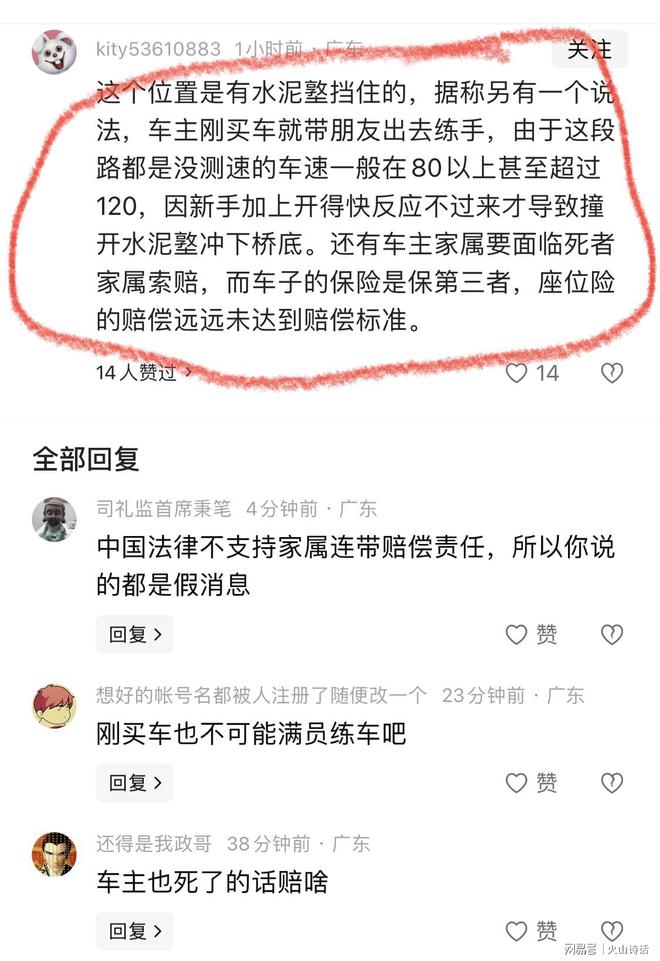值得关注的是,有网友爆料称,这个位置是有水泥墪挡住的,据称另有一个说法,车主刚买车就带朋友出去练手,由于这段路都是没测速的车速一般在80以上甚至超过120,因新手加上开得快反应不过来,才导致撞开水泥墪冲下桥底。还有车主家属要面临死者家属索赔,而车子的保险是保第三者,座位险的赔偿远远未达到赔偿标准。
