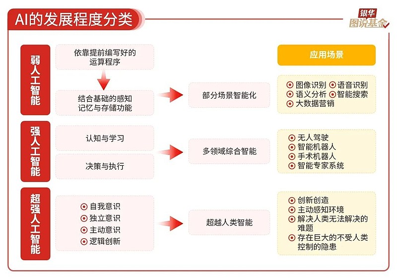 3、AI的技术可以分为弱人工智能、强人工智能、超强人工智能三类。从发展阶段来看,目前已基本度过弱人工智能环节,正在逐步实现强人工智能应用,而超强人工智能仅处于理论阶段。