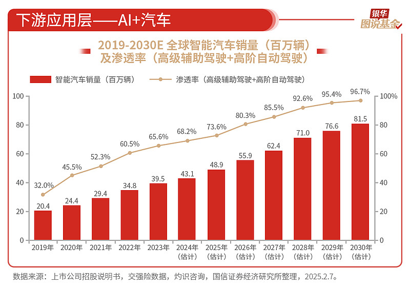 28、智能驾驶指汽车通过各种传感器收集路况信息,AI算力对数据实时分析处理,让汽车做出驾驶决策的技术。简单来说就是让汽车能够“看路况、做决策、控方向”。2019年以来,全球智能汽车渗透率逐年提升,预计到2030年可达到99%以上。