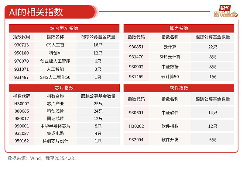 45、CS人工智(930713)全称中证人工智能主题指数,选取50只业务涉及为人工智能提供基础资源、技术以及应用支持的上市公司证券作为指数样本,涵盖AI芯片、云基础设施、软件开发及应用等全产业链。