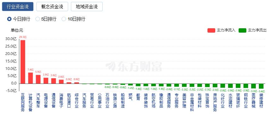 行业资金方面,截至收盘,互联网服务、计算机设备、汽车整车等净流入排名靠前,其中互联网服务净流入29.32亿。
