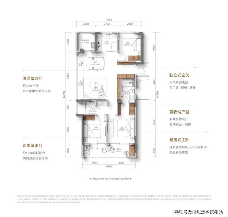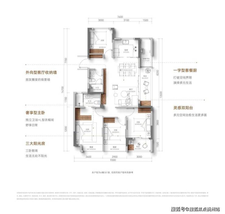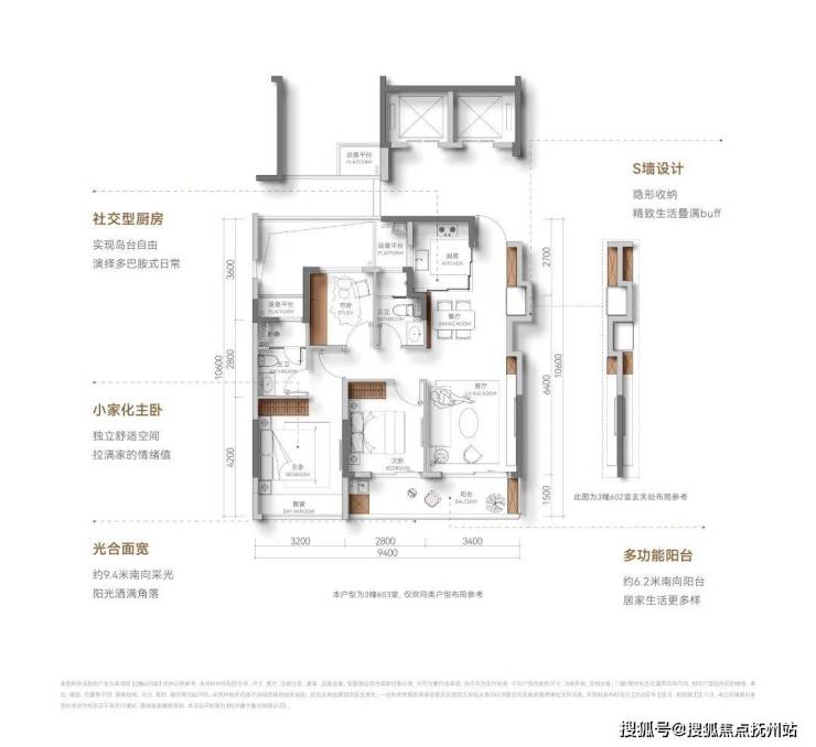 96㎡户型,三房两卫,三开间朝南,约6.2米的南向双联阳台,同时「S墙设计」巧妙增加收纳空间。
