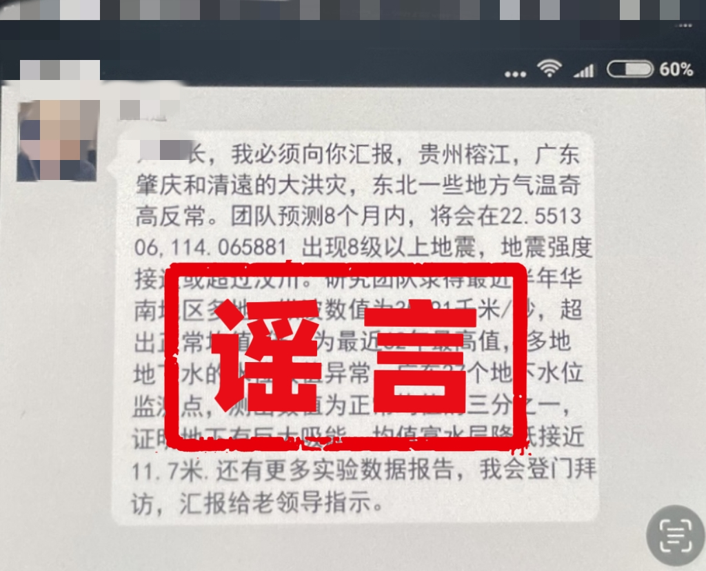 近日,六安公安网安部门查明,网民匡某出于炫耀心理,在多个微信群转发“倪四道院士预测广东地震灾害”相关谣言截图,造成该谣言信息传播扩散,引发社会恐慌,扰乱公共秩序。公安机关依法对张某川处以行政处罚。