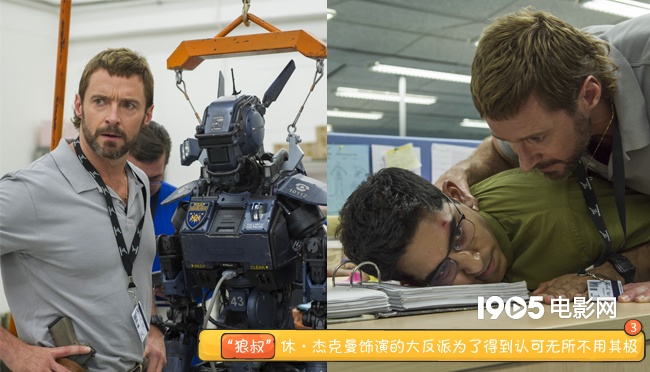 人工智能养成过程永远必须要有大反派来干扰,《超能查派》也不例外。但这次跳出来搞破坏的居然是我们的“狼叔”休杰克曼。作为和迪恩同样才华横溢的机器人设计师,狼叔设计出来的“驼鹿”型号因为太大只火力装备太强大,其实更适合重大战事而不是城市维稳。所以在销路上根本不及迪恩的警察机器人卖得火爆,这恶性循环导致狼叔一方面申请不到足够的设计经费,一方面在公司的地位也不如迪恩高。自此怀恨在心暗中搞破坏,偷偷用病毒程序破坏了全城正在运作中的警察机器人,导致城市犯罪率直线上升。可怕的是,反派永远藏得好深,如果不是在查派身上残留的病毒程序没有被清除,迪恩差点还不知道背后捣鬼的人就是这个整天神经兮兮的同事。而追究到底,狼叔不过也是想让自己的才华得到认可,希望自己的作品能在现实中有发挥作用的空间,也是个有理想的热血青年。