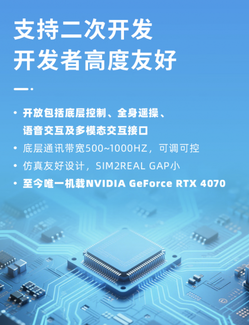 在二次开发场景中,青心意创Orca I 标准版人形机器人还能发挥更丰富的作用。机器人开放包括底层控制、全身遥控、语音交互及多模态交互接口;底层通讯带宽500~1000HZ,可调可控等设计,也对二次开发用户非常友好。值得一提的是,该款机器人还是至今唯一搭载NVIDIA GeForce RTX 4070的产品,性能表现十分优秀。